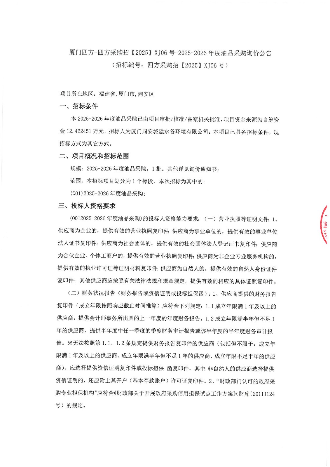 厦门四方-四方采购招【2025】XJ06号-2025-2026年度油品采购询价公告
