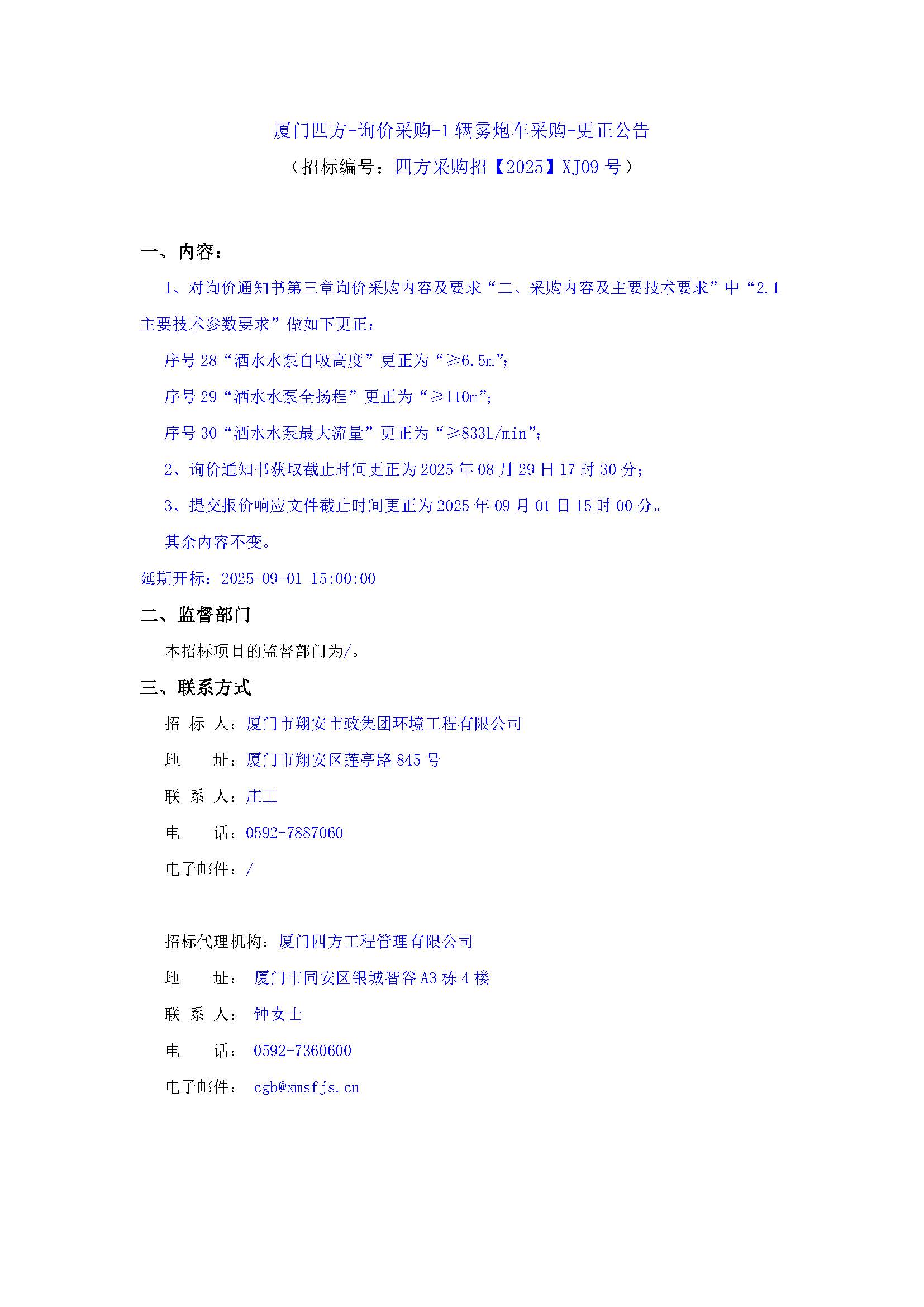 厦门四方-询价采购-1辆雾炮车采购-更正公告